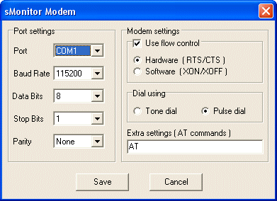 Execute script: Modem settings button. This button invokes the modem communication settings windows (see below).